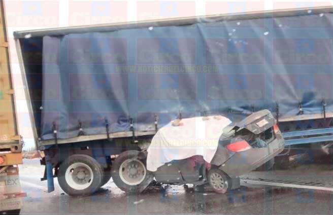 PINOS, ZAC.- Una mujer perdió la vida y un hombre resultó lesionado tras un choque entre un camión quinta rueda y un automóvil.