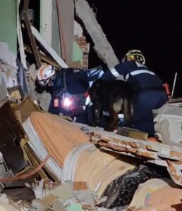 El comandante Refugio Sánchez y su binomio canino “Ruger” localizaron a la fémina enterrada a aproximadamente dos metros de profundidad entre los escombros del domicilio colapsado.