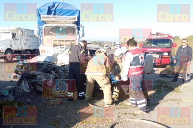 SAN JUAN DE LOS LAGOS, JAL.- Un choque entre un camión tipo torton y una camioneta dejó saldo de un muerto, que resultó el conductor de la segunda unidad de motor y que quedó prensado en la cabina.