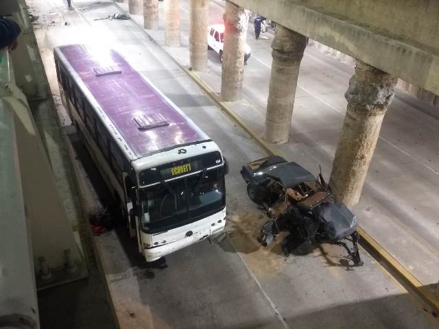 El Mustang era guiado a velocidad inmoderada y al entrar al paso desnivel a la altura de Quezada Limón se impactó contra uno de los pilares, lo que provocó que rebotara y chocara contra un camión de transporte de personal que iba en el mismo sentido.