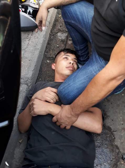 Uno de los tipos fue tirado al piso y el civil le puso una rodilla en el cuello, aunque en esos momentos llegó otro vecino y al ciudadano lo golpeó con un casco, por lo que los otros testigos le hicieron saber que el delincuente era el que ya estaba en el suelo.