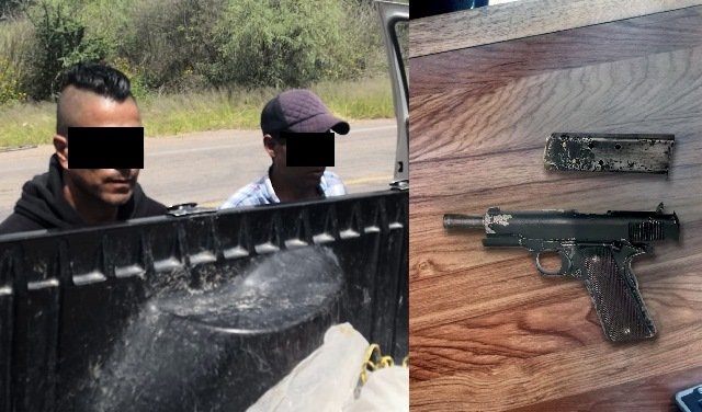 ASIENTOS, AGS.- Luego de una persecución por la carretera estatal número 12, elementos de la Secretaría de Seguridad Pública del Estado llevaron a cabo la detención de dos sujetos ex policías municipales del Estado de Zacatecas, quienes se desplazaban en un vehículo Volkswagen, color gris, en cuyo interior se localizó un arma de fuego calibre .45 con tres cartuchos útiles.