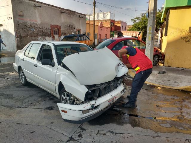 AGUASCALIENTES, AGS.- Por no respetar un disco de alto obligatorio, una mujer al volante de su automóvil provocó un aparatoso accidente al colisionar contra otro y luego estrellarse contra la barda de un domicilio.