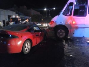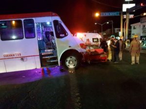 LAGOS DE MORENO, JAL.- Tres hombres resultaron lesionados de gravedad tras de que el automóvil en que viajaban chocó fuertemente contra un camión urbano en el cruce del bulevar Orozco y Jiménez y la calle 5 de Mayo, la noche del domingo 14 de enero.