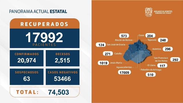 AGUASCALIENTES, AGS.- Se suman otros 30 contagios de coronavirus en un solo día, con lo que se llega a la cifra de 20,974 casos acumulados en el Estado, de los cuales más de 17,000 se registran sólo en el municipio capital.