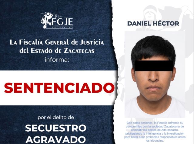 ZACATECAS, ZAC.- El equipo de investigación adscrito a la Fiscalía Especializada en Delitos de Alto Impacto obtuvo sentencia condenatoria mediante procedimiento abreviado en contra de Daniel Héctor por el delito de secuestro agravado con una pena de 33 años 4 meses de prisión.