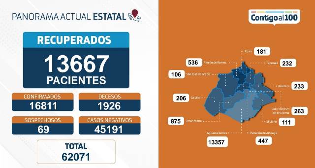 AGUASCALIENTES, AGS.- Otros 85 contagios de coronavirus se sumaron a la lista de un día para otro en Aguascalientes, con lo que se llega a una cifra de 16,811 casos acumulados, de los cuales 667 están atravesando por la enfermedad y existen 69 personas en observación sospechosas de contraer el virus.