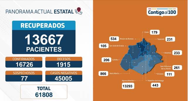 AGUASCALIENTES, AGS.- Se reportan 88 casos de coronavirus en un solo día, uno de los números más altos desde que se iniciaron los contagios en Aguascalientes para llegar a la cifra de 16,726 casos acumulados, de los cuales 650 atraviesan por la enfermedad y 77 personas se encuentran en observación por sospecha de contraer el virus.