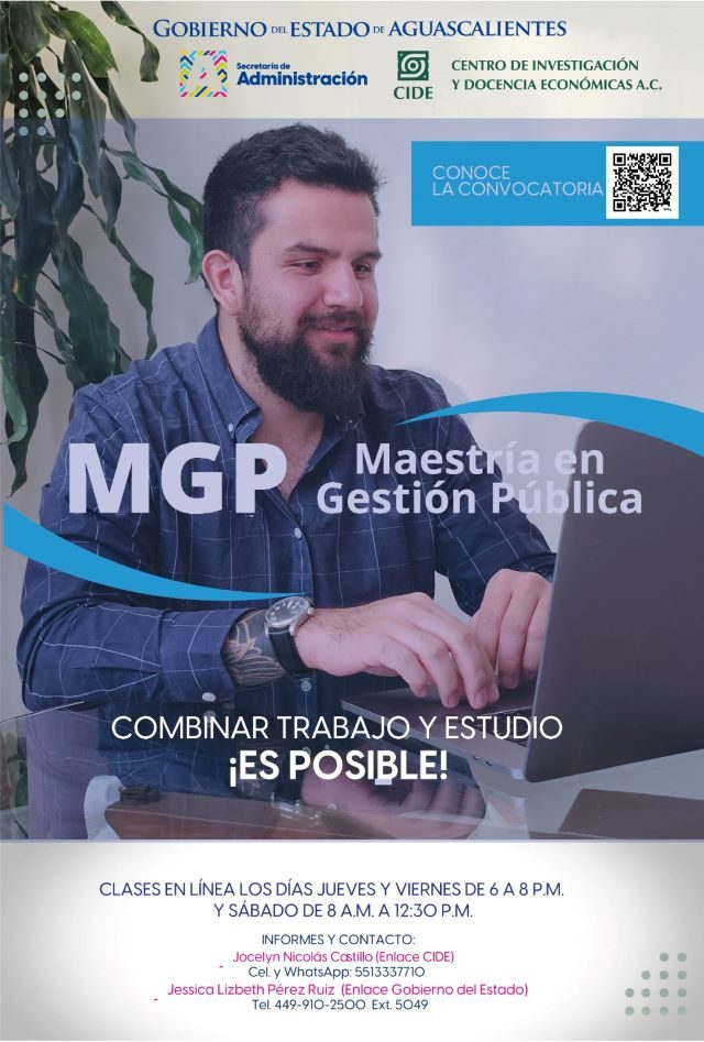 AGUASCALIENTES, AGS.- La Secretaría de Administración del Estado de Aguascalientes, en colaboración con el Centro de Investigación y Docencia Económicas (CIDE), invita a quienes estén interesados en incrementar sus conocimientos y fortalecer sus capacidades profesionales, a inscribirse en la Maestría en Gestión Pública (MGP).