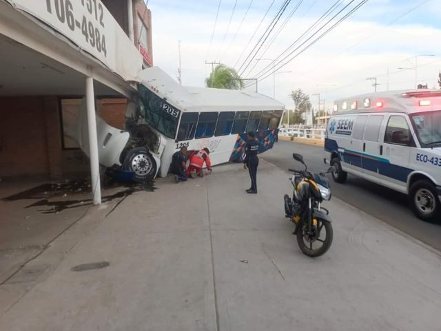 AGUASCALIENTES, AGS.- Una tragedia estuvo a punto de provocar un camión urbano YOVOY en las inmediaciones del fraccionamiento Los Sauces tras de que, aparentemente por una falla mecánica, se estrelló contra un poste de madera y la fachada de un establecimiento comercial.