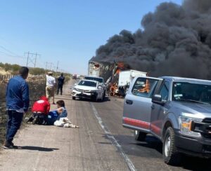 Tras la colisión, el tráiler y la camioneta se incendiaron, por lo que ambas unidades fueron abrasadas por las llamas.