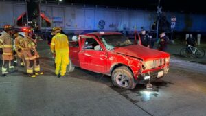 AGUASCALIENTES, AGS.- Un adulto mayor sufrió una probable fractura de fémur tras de que al volante de su camioneta fue embestido por el tren en las avenidas Paseo de la Cruz y Ferrocarril, en el Infonavit IV Centenario.