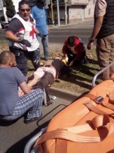 Paramédicos de la Cruz Roja de inmediato se trasladaron al sitio y comenzaron a brindarle los primeros auxilios al peatón, diagnosticándole lesiones de gravedad, por lo que al determinar que su vida corría peligro de urgencia lo trasladaron al hospital de la calle Galeana para su pronta atención.