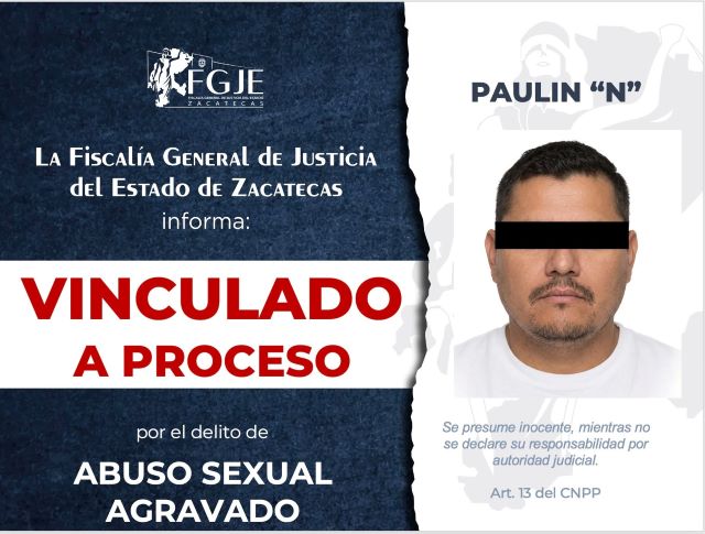 ZACATECAS, ZAC.- La Unidad de Investigación Mixta de Río Grande logró la vinculación a proceso por el delito de abuso sexual agravado en contra de Paulin “N”, a quien se le impuso medida cautelar de prisión preventiva.