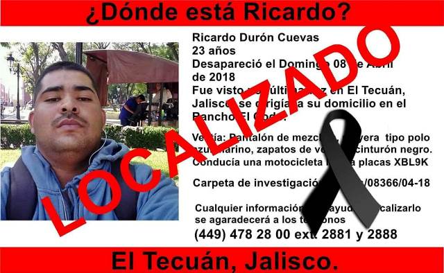 Se trata de Ricardo Durón Cuevas, de 23 años y que tenía su domicilio en el rancho El Codo, perteneciente al municipio de Aguascalientes.