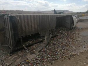 El tráiler avanzó varios metros más y luego se volcó sobre su costado derecho, por lo que el operador salió de la cabina como pudo y se dio a la fuga, mientras que el vidrio reciclado terminó regado por toda la cinta asfáltica.