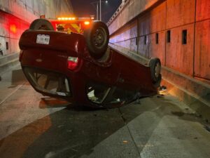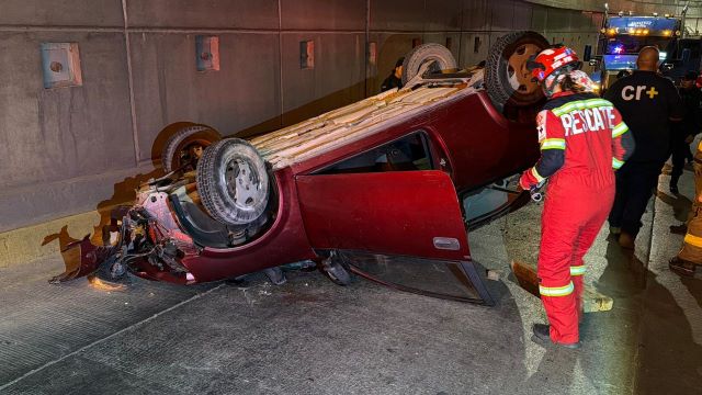 El automóvil se impactó primero contra el muro de contención y posteriormente rebotó hacia el muro contrario, para finalmente volcar y quedar sobre su toldo.