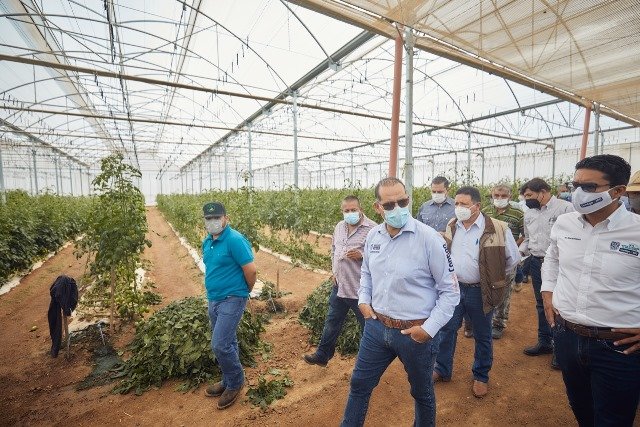 ASIENTOS, AGS.- El gobernador Martín Orozco Sandoval visitó los invernaderos Charco Azul, en donde el director Víctor Santiago Macías de Lira explicó las ventajas de este sistema de producción, al tener un control total de los cultivos y detalló el funcionamiento de la agricultura protegida que realizan con la que se garantiza una mayor productividad.