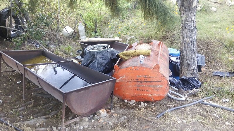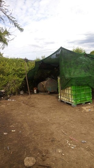 A unos 200 metros de ahí se localizó un comedero para ganado con 200 litros de diesel así como una pipa color rojo con mil litros de combustible, además de 4 tambos con capacidad de 200 litros completamente abastecidos.