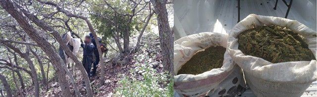 Al desplazarse 600 metros cuesta arriba del plantío asegurado en días pasados, los uniformados detectaron un alambre metálico sujetado de dos árboles, del cual colgaban dos costales de plástico en color blanco que en su interior contenían marihuana, con un peso aproximado de 12 kilogramos, lo que representa alrededor de 24 mil dosis.