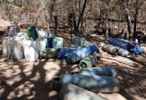 En el área de almacenamiento de pre-precursores fueron asegurados aproximadamente 63,100 litros de diferentes sustancias, entre las que destaca el cloruro de bencilo, así como 125 kilogramos de sosa cáustica.