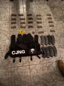 Al desahogar los cateos, los elementos ministeriales lograron el aseguramiento de 9 armas de fuego largas, un arma de fuego corta, 76 cargadores, 2 mil 780 tiros útiles de los calibres 7.26 x 39 y .50, 17 chalecos, 22 pecheras, ropa táctica con las características de la utilizada por la Guardia Nacional, así como prendas con las siglas de un grupo de la delincuencia organizada, boinas y botas militares, además de diversos equipos de telefonía celular.