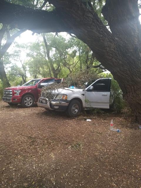 Una camioneta Pick-Up, aparentemente desvalijada, de la marca Ford Platinum, de color guinda, doble cabina, modelo 2017, sin placas de circulación, misma que al ser consultada en el sistema de Plataforma México arrojó reporte de robo vigente en el Estado de Jalisco; en esta unidad se encontró un cargador abastecido con 27 cartuchos útiles, calibre 7.62×39 y 13 cargadores sin abastecer de plástico en color negro para calibre 7.62×39.