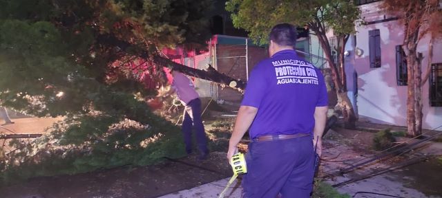 Acompañados por trabajadores de la Secretaría de Servicios Públicos Municipales, la Coordinación Municipal de Protección Civil atendió 14 reportes, entre los que se encuentran 7 árboles caídos en los fraccionamientos J. Guadalupe Peralta, Haciendas de Aguascalientes, Bosques, El Riego, Norias de Paso Hondo y en la curva de la UAA; 2 encharcamientos en las colonias San Pablo y Buenos Aires, un accidente vehicular, un vehículo dañado por árbol, 2 postes caídos en el fraccionamiento Haciendas de Aguascalientes y una malla ciclónica en riesgo de caída en el fraccionamiento Arboledas.