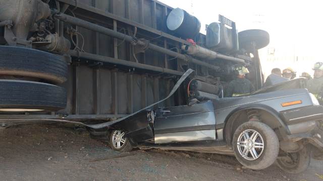 AGUASCALIENTES, AGS.- Impresionante accidente ocurrió en el entronque de las carreteras federales 45 Norte y 25, donde un tráiler impactó una camioneta y un auto que ésta remolcaba y luego se volcó, aplastando el coche, por lo que un joven resultó lesionado y fue hospitalizado.