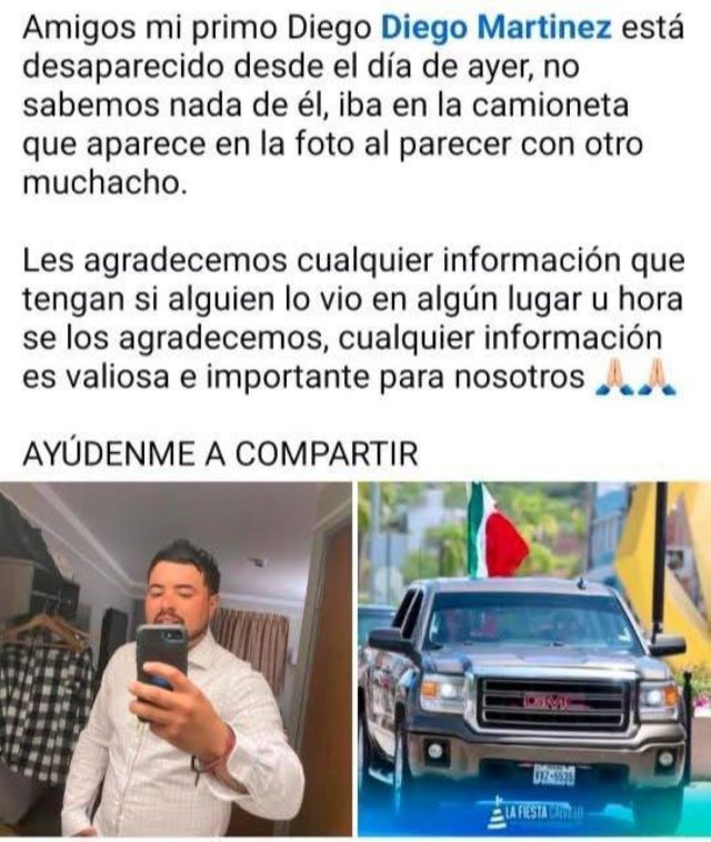 A través de las redes sociales se difundieron fotografías de los desaparecidos: Diego Martínez y Luis Ángel Gallegos Ramírez, de 24 años de edad.