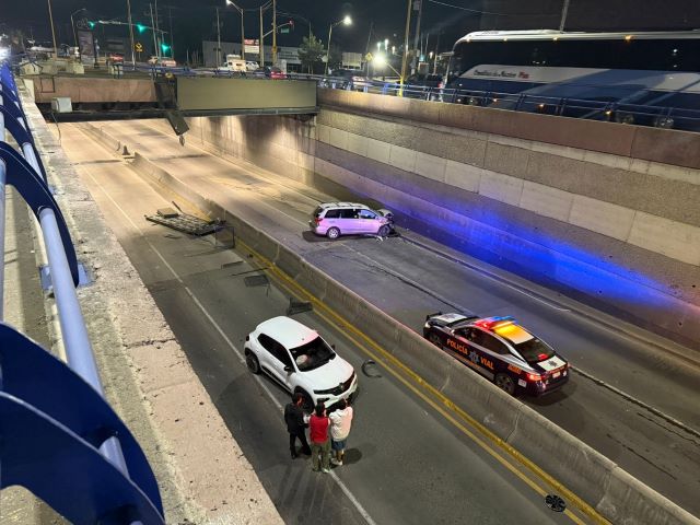 Oficiales de la Policía Vial intervinieron en el accidente y cerraron la circulación vehicular en ambos sentidos del paso a desnivel de la avenida Aguascalientes en tanto se retiraban las dos unidades de motor así como los objetos derribados.
