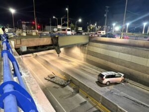La estructura metálica del barandal, escombros y las pantallas de publicidad derribadas desde lo alto del puente también cayeron sobre el paso a desnivel del segundo anillo y alcanzaron un auto Renault Kwid, en color blanco, conducido por Dante “N”, de 19 años de edad, que transitaba por esta vialidad de poniente a oriente.