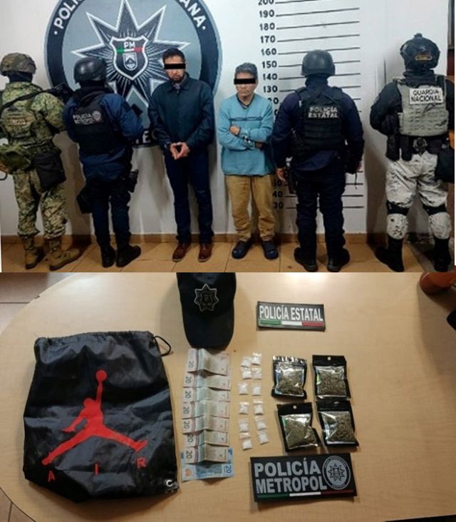 Durante la revisión, se les localizaron 12 envoltorios de plástico transparente que contenían una sustancia blanca y granulada con características propias de la metanfetamina, así como 4 bolsas plásticas con hierba verde y seca con características similares a la marihuana, motivo por el cual se efectuó el aseguramiento de la presunta droga.