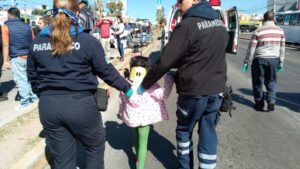 5.- Nissan Versa, color blanco, con placas de Aguascalientes, conducido por Jaime, de 35 años, que iba acompañado de María Elena, de 34 años, y la niña N., de 5 años de edad, que resultaron lastimadas y fueron trasladadas a recibir atención al Hospital 2 del IMSS.