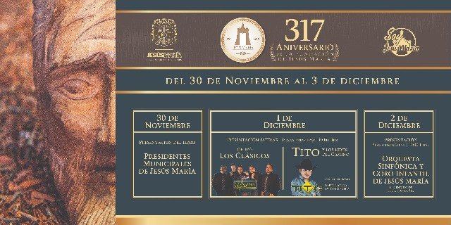 JESÚS MARÍA, AGS.- El Ayuntamiento de Jesús María, encabezado por el presidente municipal, Noel Mata Atilano, celebrará el 317 aniversario de la fundación de la tierra que fue conocida como “Xonacatique”, hoy Jesús María, los cuales tendrán fecha del 30 de noviembre al 3 de diciembre.