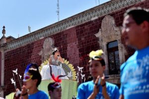AGUASCALIENTES, AGS.- El gobernador Martín Orozco Sandoval, acompañado por la presidenta del DIF Estatal, Yolanda Ramírez de Orozco, presenciaron junto con cerca de 90 mil asistentes, el tradicional Desfile de Primavera bajo el nombre para este año De Sueños y Ensueños, como parte de la celebración del 190° aniversario de la Feria Nacional de San Marcos, y que en esta ocasión fue renovado al incluir elementos de tecnología de animación y sonorización junto con escenarios animados, algunos de hasta 12 metros de altura.