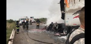 Al arribar las unidades de emergencia al lugar observaron dos vehículos involucrados, un tráiler con caja con placas de circulación 299EH8 sin razón social visible y una camioneta Pick-Up, los cuales se habían impactado de manera frontal, provocando que se incendiara de manera inmediata debido al impacto.