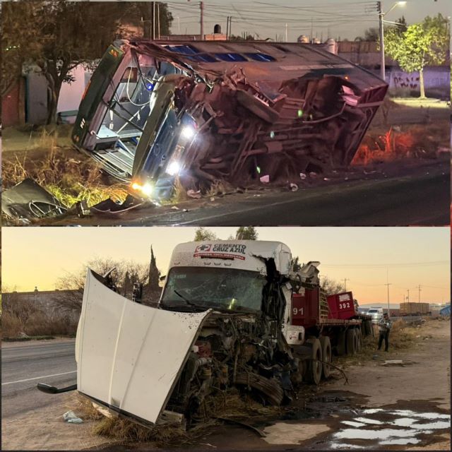 AGUASCALIENTES, AGS.- Un fuerte choque frontal ocurrido a las 05:40 horas sobre la carretera 71 Norte dejó como saldo a dos conductores en estado grave y a cinco pasajeros con lesiones menores, luego de que un tráiler invadiera el carril contrario y se impactara de frente contra un camión de pasajeros.