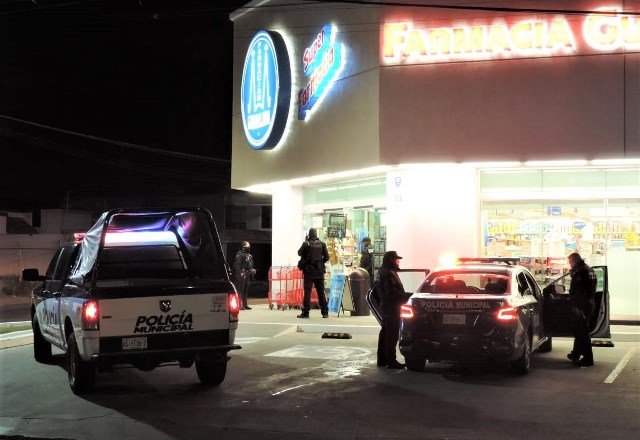 El robo con violencia sucedió en la Farmacia Guadalajara ubicada sobre la avenida Héroe de Nacozari y la calle Servicio Militar, en el fraccionamiento Héroes de Aguascalientes, a unos metros de una residencia de militares.