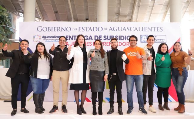 AGUASCALIENTES, AGS.- La gobernadora Tere Jiménez entregó apoyos a beneficiarios del programa Emprende-T, con el que se impulsa a jóvenes emprendedores hasta con 100 mil pesos para crear o consolidar empresas innovadoras que les ayuden a mejorar su economía.