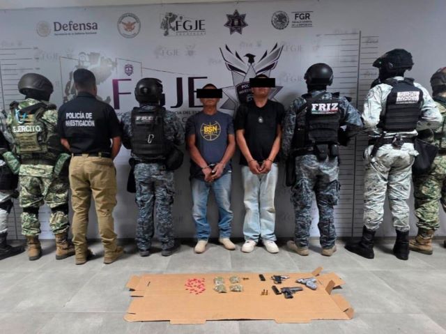 LORETO, ZAC.- Agentes de la Fuerza de Reacción Inmediata Zacatecas (FRIZ), Ejército Mexicano y Guardia Nacional (GN), detuvieron a dos hombres que portaban armas de fuego y probable droga en la comunidad El Tepetate.