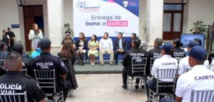 “Somos conscientes de las dificultades a las que se enfrentan en el desarrollo de su labor, por eso hoy quiero felicitar a quienes reciben este día el bono económico por el sacrificio que hacen en beneficio de su ciudad. Además, quiero destacar el trabajo impulsado por la alcaldesa Tere Jiménez para lograr el equipamiento en uniformes, que fueron entregados a los Policías Municipales, y por la próxima entrega de nuevas patrullas”.