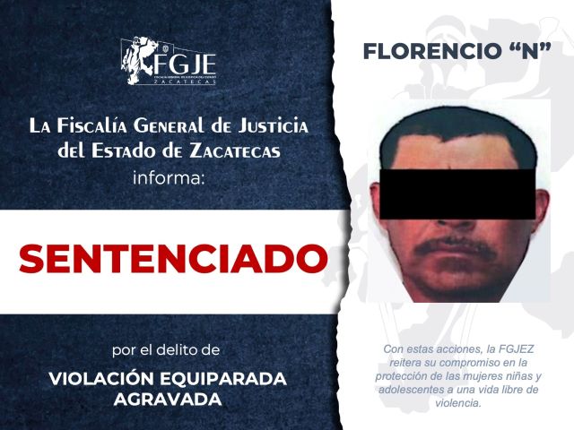 ZACATECAS, ZAC.- La Unidad de Investigación Mixta del Distrito de Ojocaliente obtuvo sentencia condenatoria en juicio oral en contra de Florencio “N” por el delito de violación equiparada agravada en perjuicio de una persona.