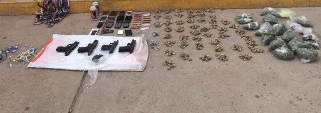Ismael Camberos Hernández, secretario de Seguridad Pública (SSP) del Gobierno del Estado, informó que los elementos policiales hallaron cinco armas de fuego cortas, una granada de fragmentación, más de dos kilos y 1 mil 186 bolsitas de vegetal verde con características y olor de la marihuana; además de diversos objetos contundentes y punzo-cortantes.