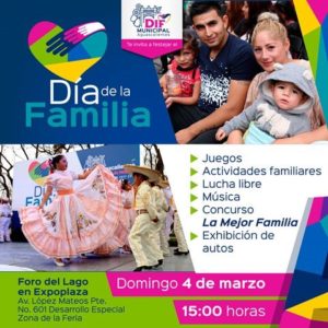 AGUASCALIENTES, AGS.- Como parte de la celebración por el “Día de la Familia “, el Sistema para el Desarrollo Integral de la Familia (DIF) Municipal de Aguascalientes invita a la población en general a participar el próximo domingo 04 de marzo en punto de las 15:00 horas en el “Foro del Lago” de Expoplaza, así lo informó el Presidente de esta Institución, Ramón Jiménez Peñaloza.