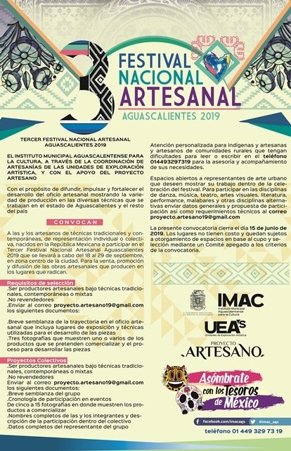 AGUASCALIENTES, AGS.- El Instituto Municipal Aguascalentense para la Cultura (IMAC) y el Proyecto Artesano de Aguascalientes dan a conocer las bases para participar en el Tercer Festival Nacional Artesanal Aguascalientes 2019 que se efectuará del 19 al 29 de septiembre en nuestra ciudad.