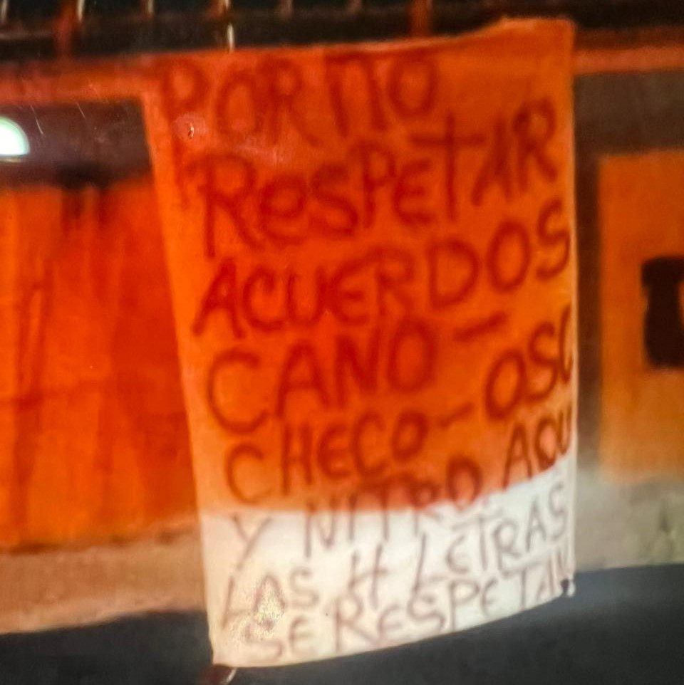 La narco-manta dejada en el puente peatonal de Margaritas decía “Por no respetar acuerdos Cano-Checo-Oso y Nitro aquí las 4 letras se respetan”.