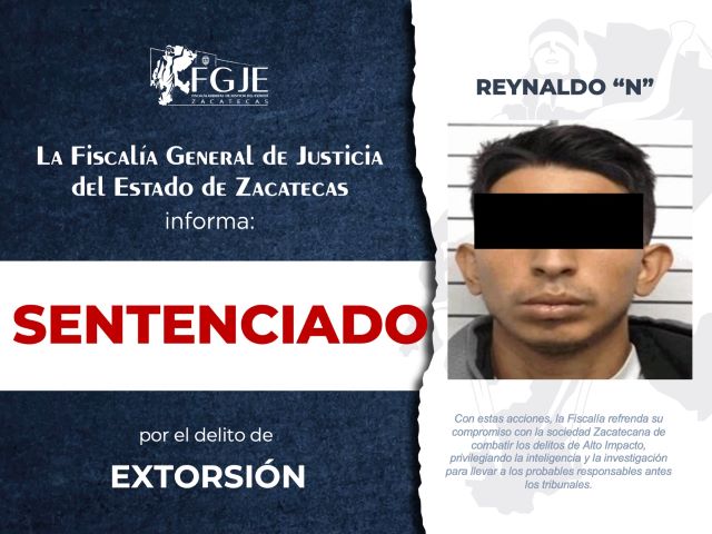 ZACATECAS, ZAC.- El equipo de investigación adscrito a la Fiscalía Especializada en Delitos de Alto Impacto obtuvo sentencia condenatoria mediante procedimiento abreviado en contra de Reynaldo “N” por el delito de extorsión, se le fijó una pena de 4 años de prisión.
