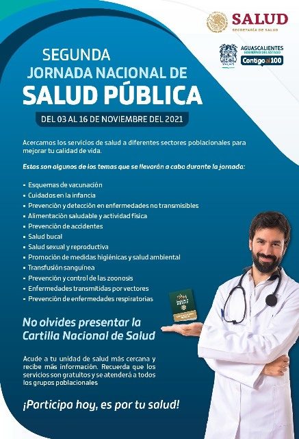 AGUASCALIENTES, AGS.- Bajo el lema “Participa hoy, es por tu salud”, el Instituto de Servicios de Salud del Estado de Aguascalientes (ISSEA), llevará a cabo la Segunda Jornada Nacional de Salud Pública 2021 del 3 al 16 de noviembre, a través de la cual se buscará acercar los servicios de salud a toda la población.