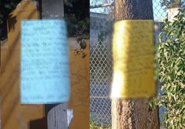 FRESNILLO, ZAC.- Por lo menos cinco narco-mensajes escritos en cartulinas fueron colocados en distintos lugares de esta cabecera municipal, por lo que fueron retirados y asegurados por las autoridades.